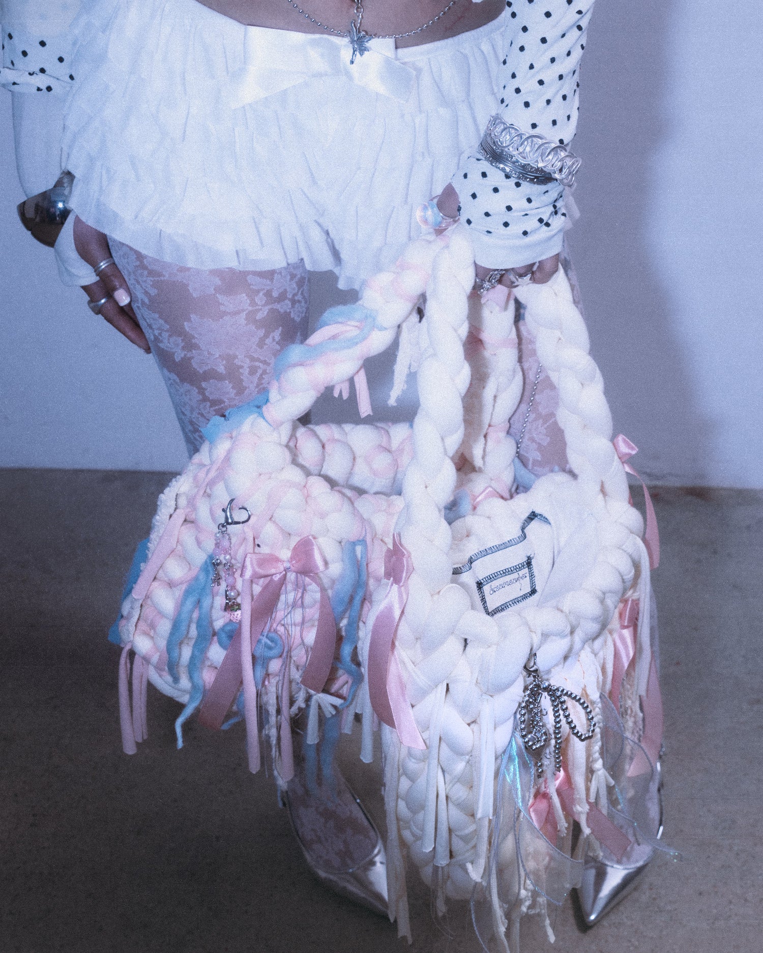 upcycled polyester & cotton Ribbons rest upon soft crochet cotton fabric. with a pearl bow detail